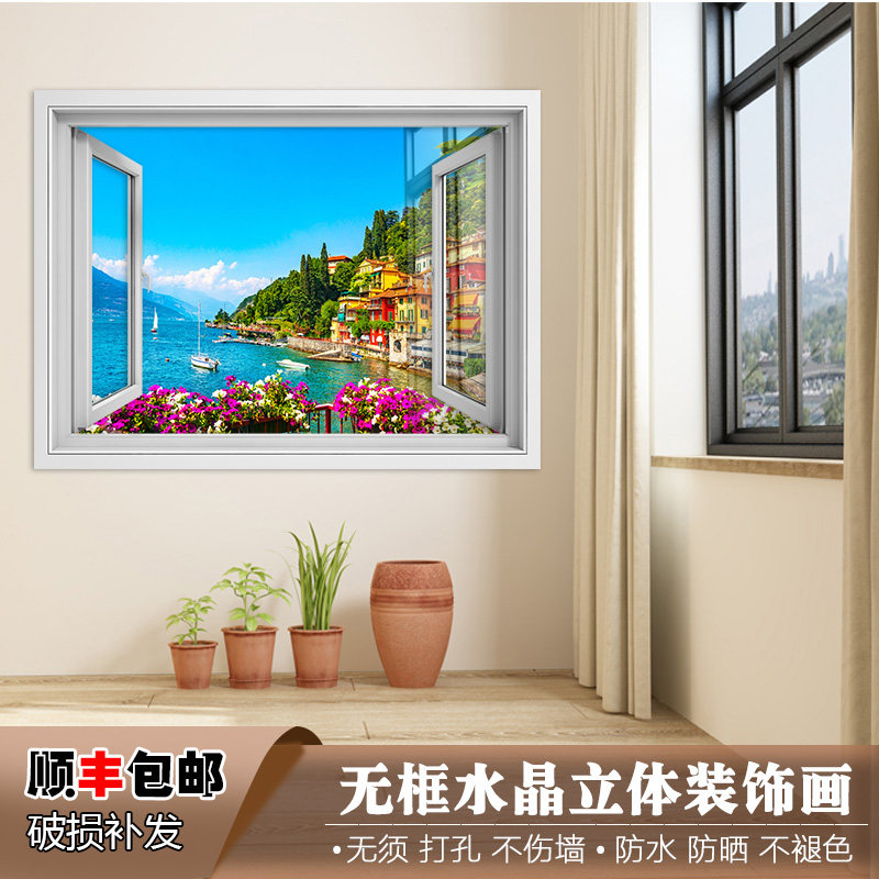 欧式立体假窗户挂画无框水晶客厅背景墙装饰画卫生间防水窗外风景热门设计联盟服务商